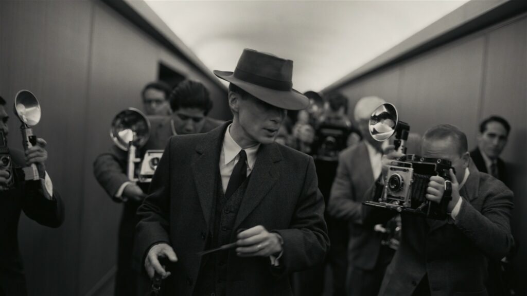 Oscar-ehdokkaat 2024 – J. Robert Oppenheimer kävelemässä sankan toimittajajoukon läpi. Kohtaus on yksi uudelle mustavalkofilmille kuvatuista jaksoista.