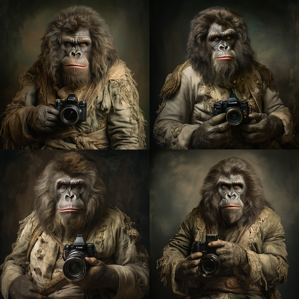 ^Gorilla kameran kanssa keskiaikaiseen öljymaalaustyyliin, Midjourneylla kuvan generointiin meni noin yksi minuutti.